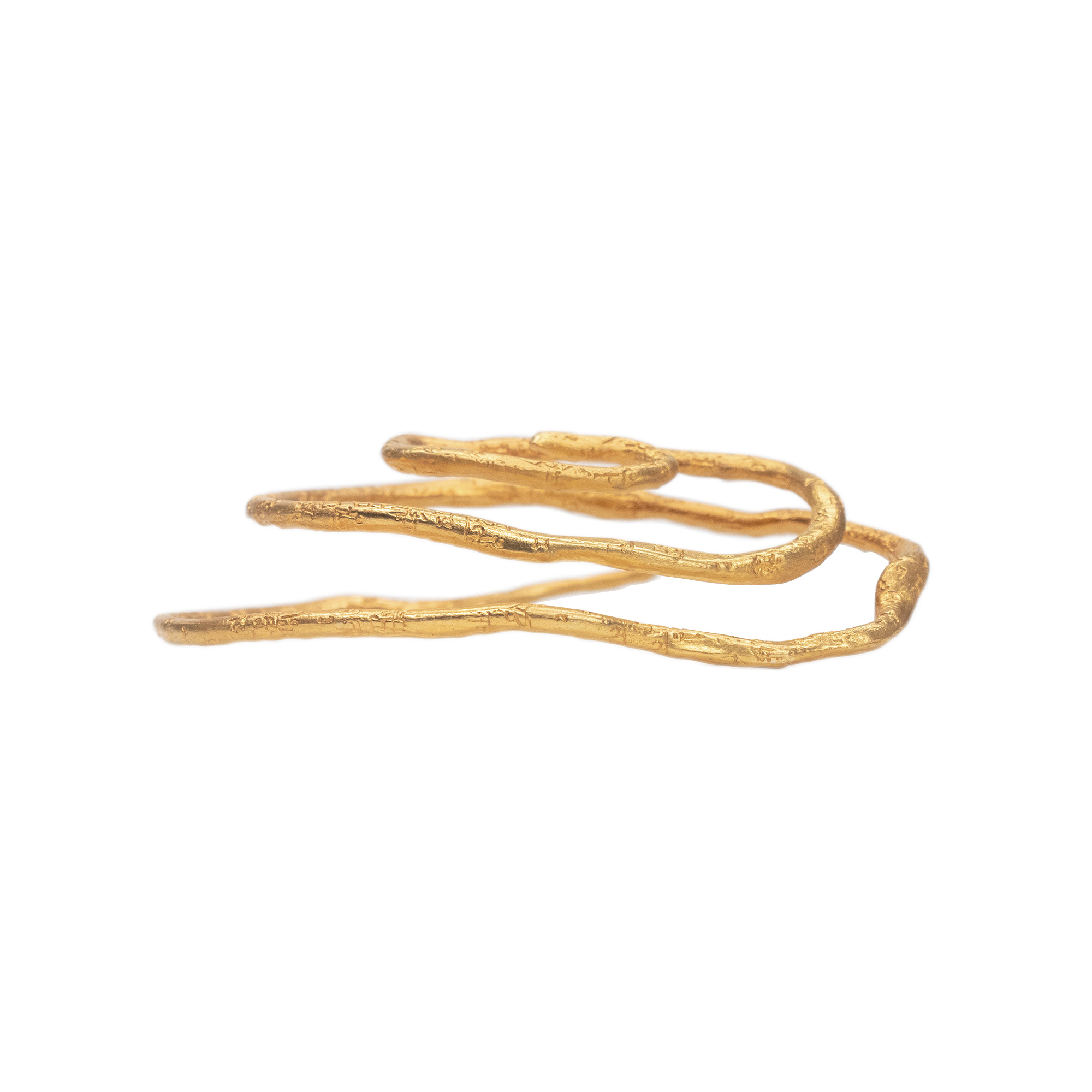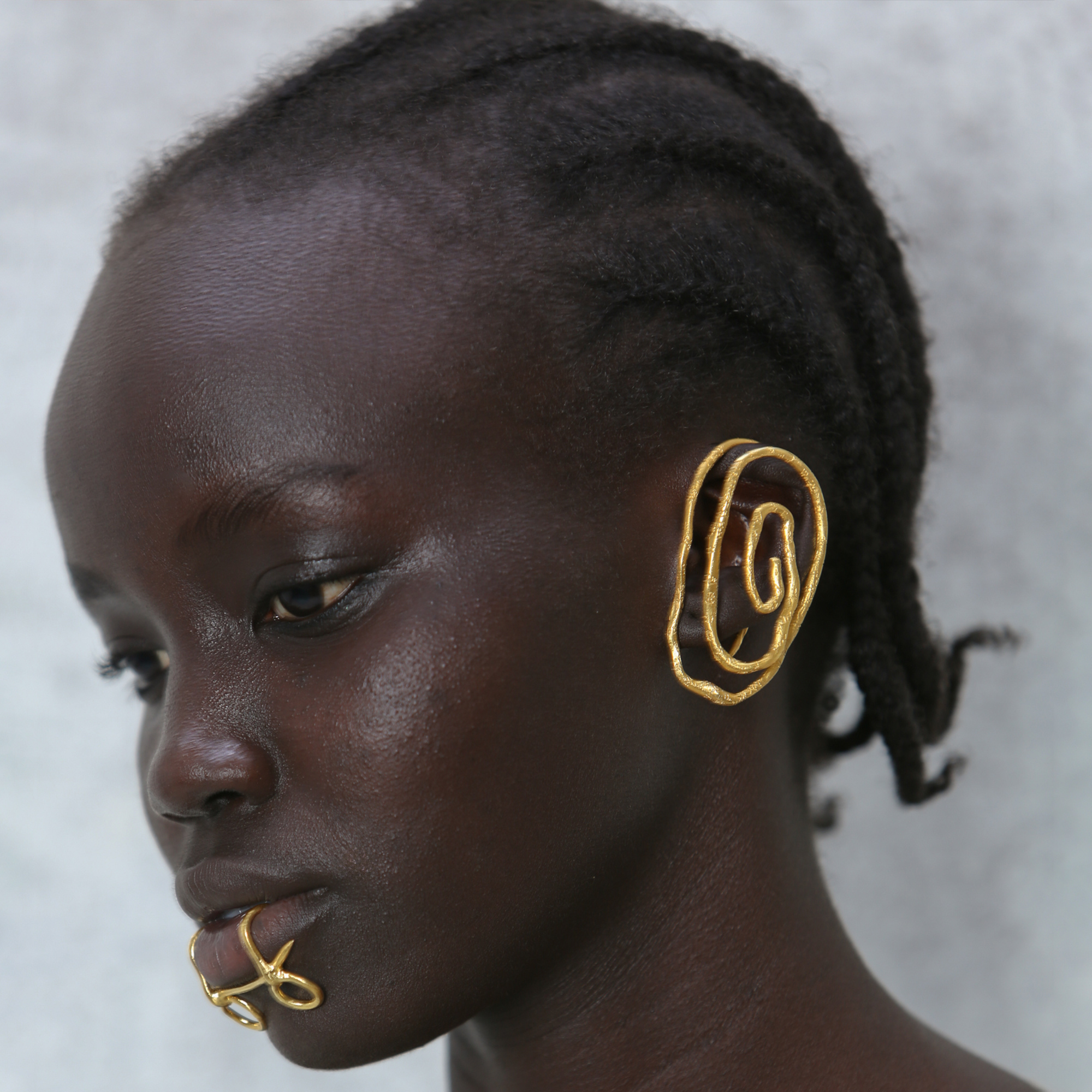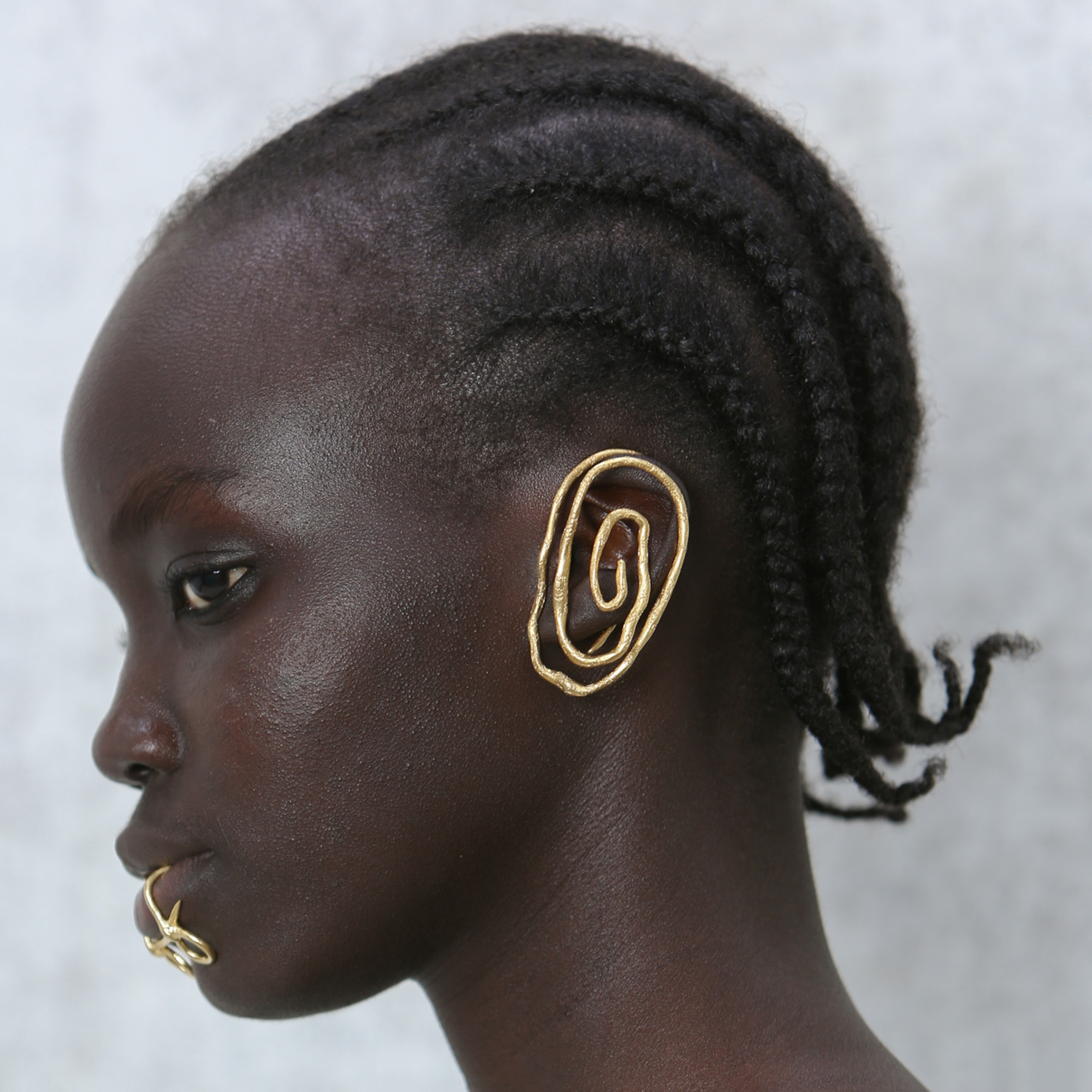 耳の形に合わせ、形状調整して耳の裏側に挟み込むように着用するゴールドのイヤーカフジュエリー。