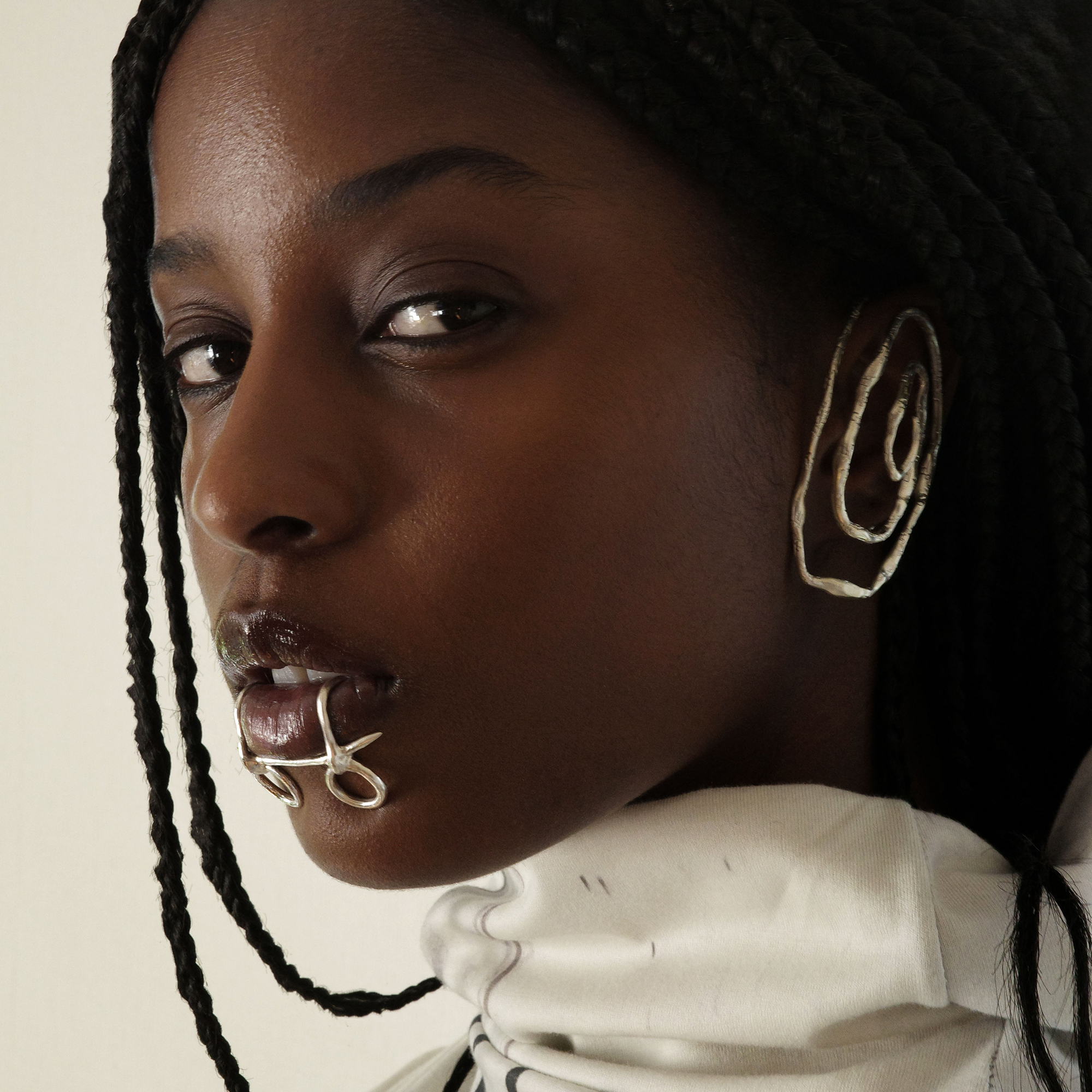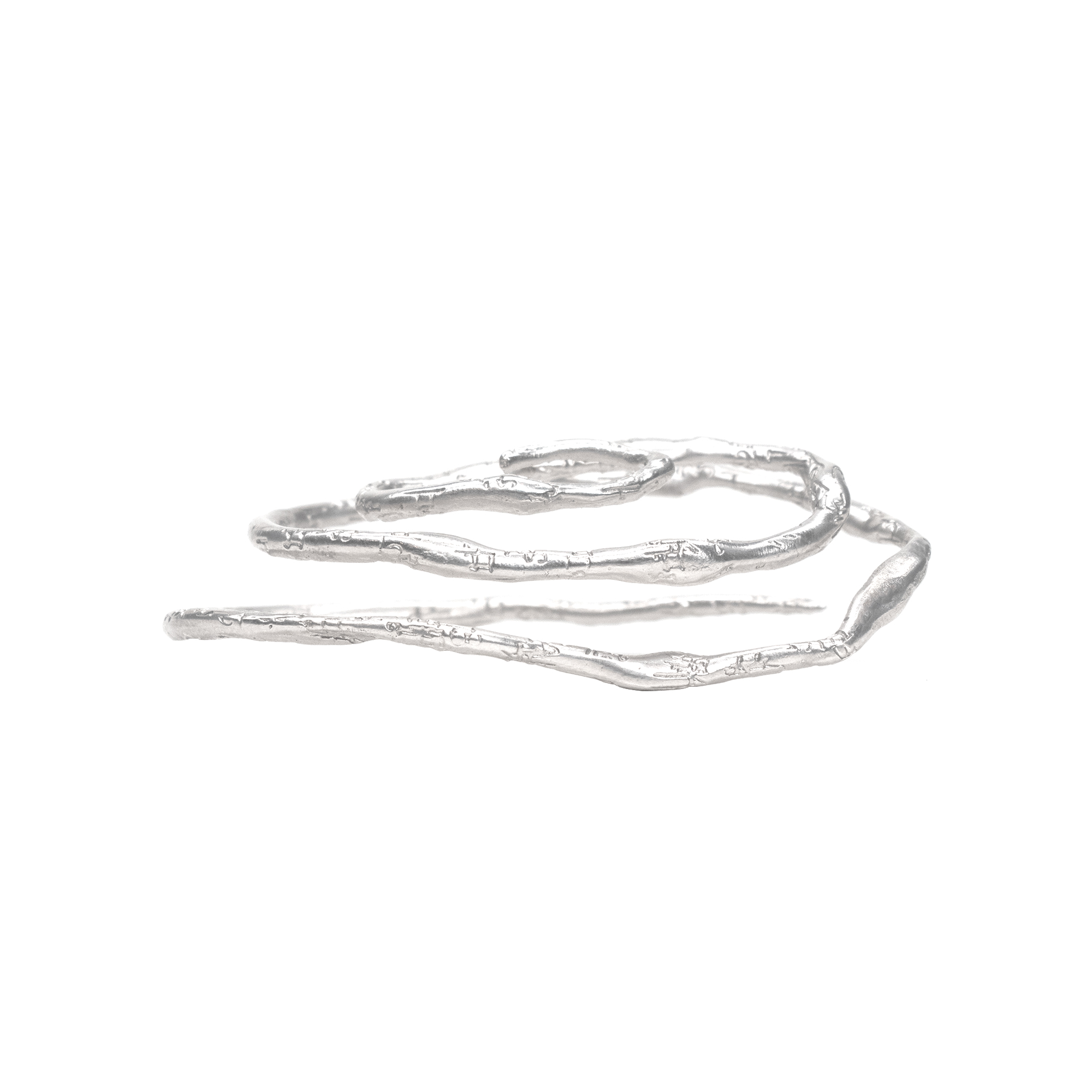 耳の形に合わせ、形状調整して耳の裏側に挟み込むように着用するシルバーのイヤーカフジュエリー。